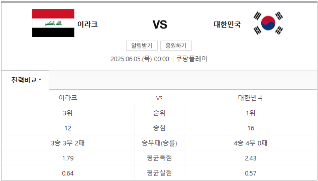 이번 맞대결은 2025년 6월 5일 목요일에 열릴 예정이며, 쿠팡플레이를 통해 생중계됩니다. 모바일과 PC 모두 시청 가능하니, 편하게 시청 준비해 보세요. 이번 경기는 본선 진출을 좌우할 수 있는 결정적 순간이 될 수 있기 때문에 관심을 집중할 필요가 있습니다. 경기는 이라크 홈에서 진행되며, 시차로 인해 한국 시각 기준으로 자정에 시작되는 점 유의하세요!