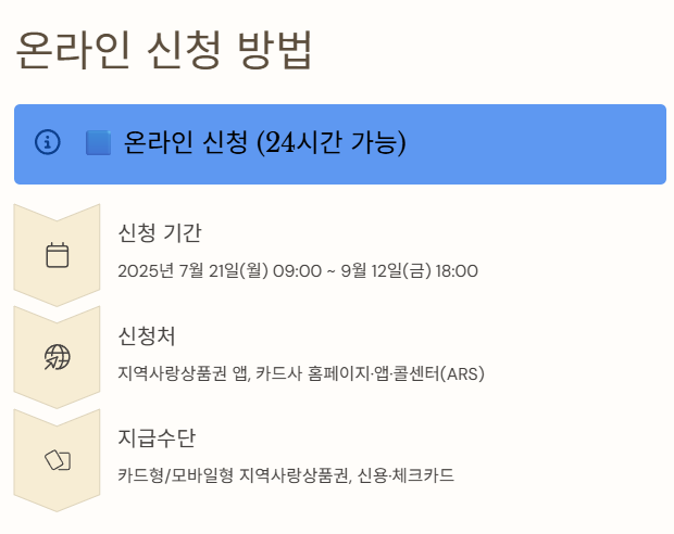 - 신청처: 지역사랑상품권 앱, 카드사 홈페이지·앱·콜센터(ARS)